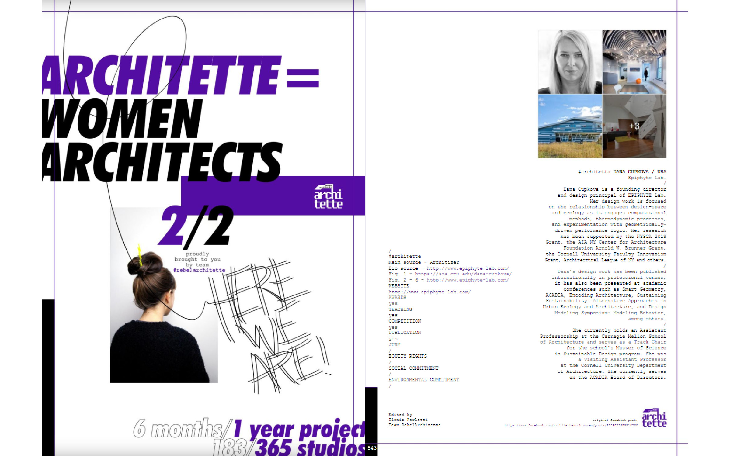 ARCHITTETE = Women Architects. Curated by Team RebelArchitette: Ilenia Perlotti, Caterina Pilar Palumbo, Elena Fabrizi. Collection of the profiles of 365 women selected in the framework of the project 365+ Venice Biennale 2018, Dan Cupkova | USA| Epiphyte lab, Pg. 543, Issue 2, Edition A, Albino (Bergamo), Italy, May, 2018.