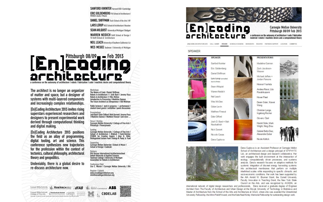 EnCoding Architecture (CMU) Posted on August 17, 2015July 7, 2025 by cupkova From Dynamic Processes to Adaptive Geometry. Conference Presentation, EnCoding Architecture Conference, Carnegie Mellon University, School of Architecture, Pittsburgh, PA, 2013. Related Published by cupkova View all posts by cupkova