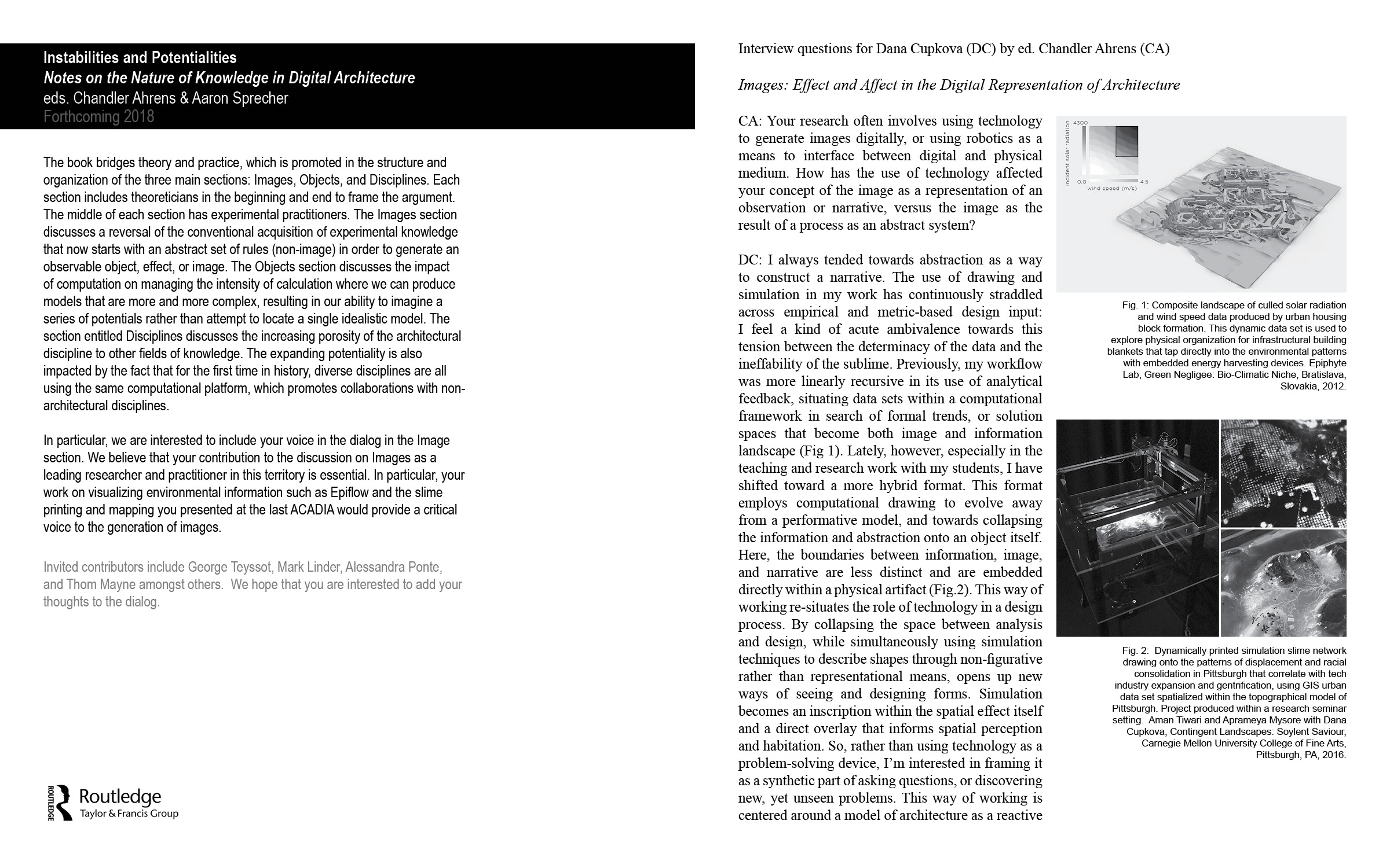 Instabilities and Potentialities Posted on January 1, 2015July 7, 2025 by cupkova Cupkova, Dana. In Interview on Images. Instabilities and Potentialities, Notes on the Nature of Knowledge in Digital Architecture. Ahrens, Chandler & Aaron Sprecher (eds.), Book Chapter (Forthcoming). Related Published by cupkova View all posts by cupkova